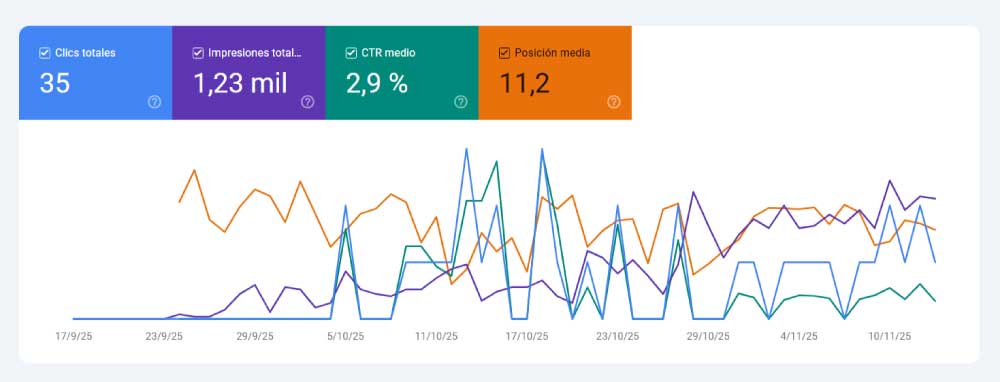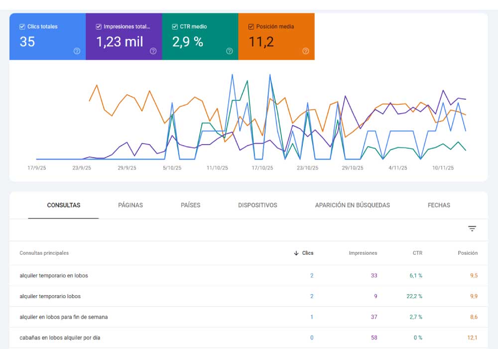 El gráfico de rendimiento en Google Search Console muestra un patrón consistente de crecimiento. No es casualidad; es el resultado de una estrategia SEO estructurada que se vuelve más fuerte con cada nueva propiedad que se suma a la plataforma.